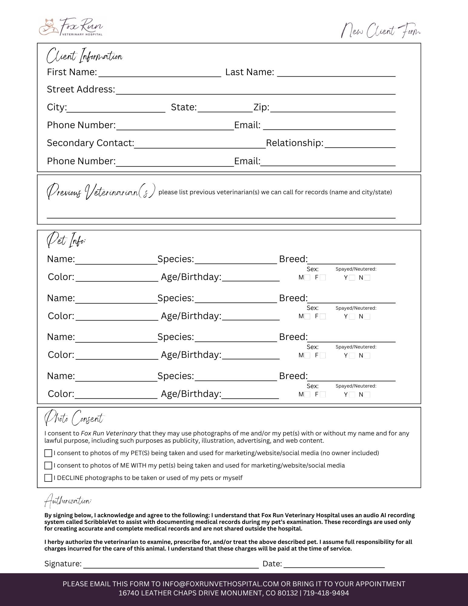 Patient FormsPlease download the following applicable forms before your visit. New Client FormPrint + Bring New Client FormFill Out + Email